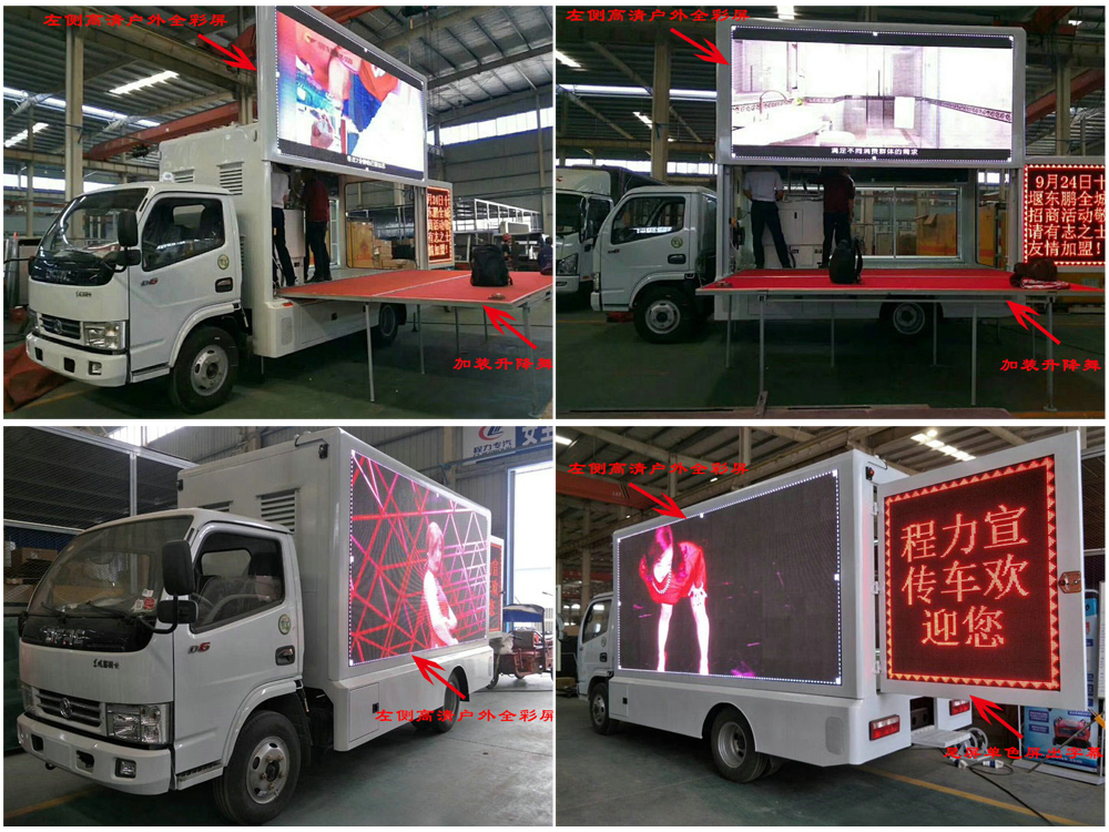 廣告車選裝配置:客戶可根據(jù)需求選裝屏幕清晰度(P10彩屏、P8彩屏、P6彩屏、P5彩屏、P4彩屏)、單面彩屏、雙面彩屏、雙